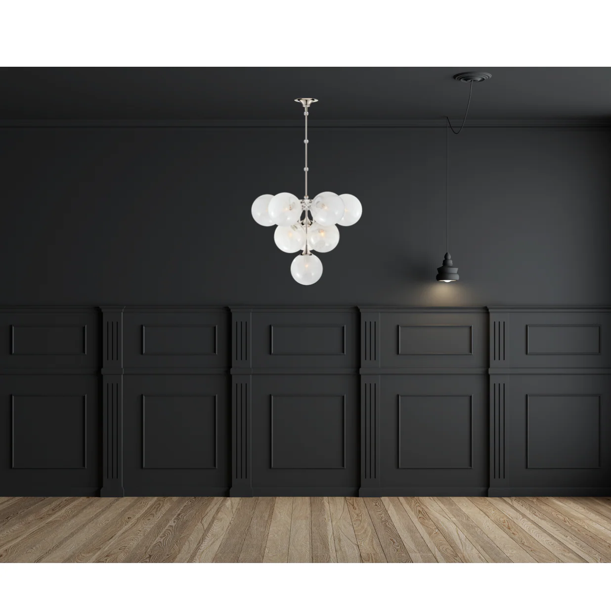We love the white strie glass globes on this Cristol Medium Chandelier by Visual Comfort. It brings a stunning and unique look to any living room, dining room, or kitchen.Â